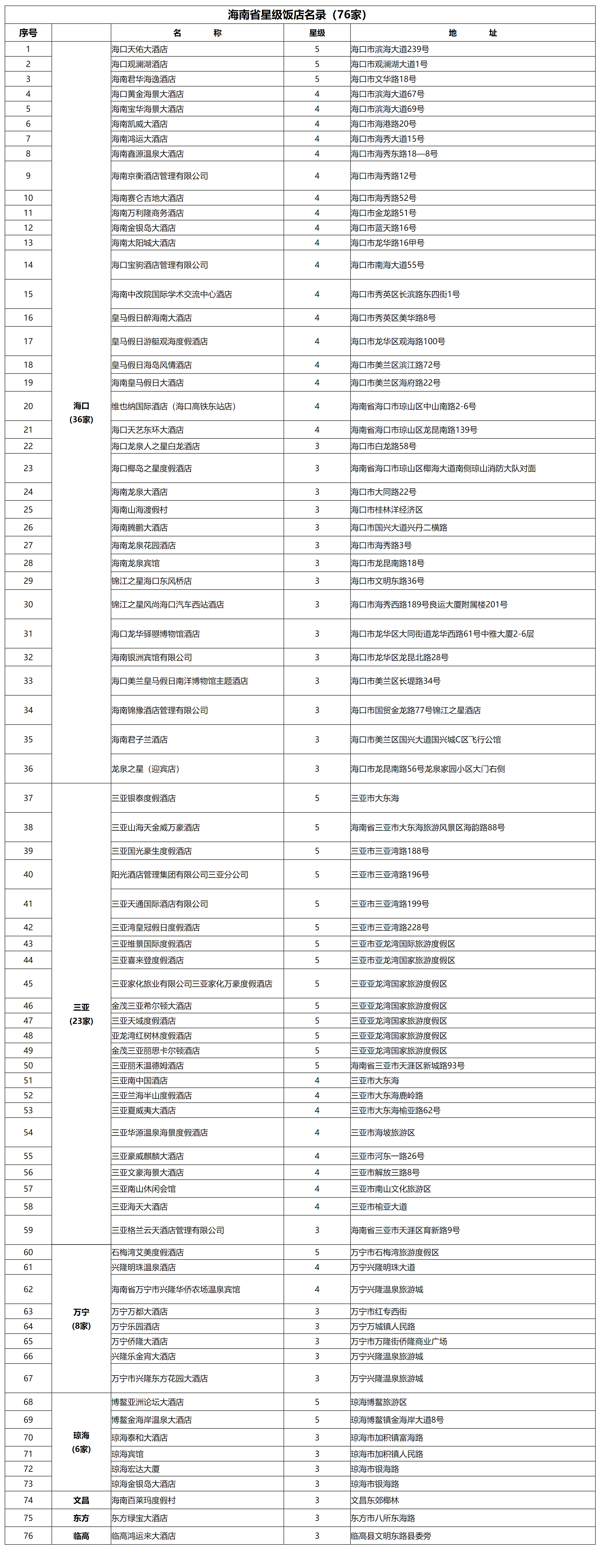 海南省星级饭店名录